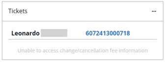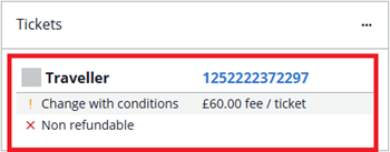 In the Ticket card, change and refund eligibility displays below the passenger name and ticket number.