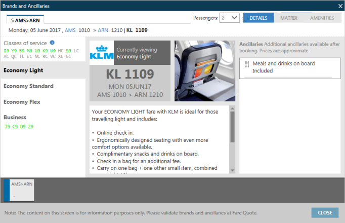 Après avoir choisi une marque, cliquez sur une classe de service pour cette marque pour réserver le vol. Notez que la classe de service sélectionnée et le nombre de passagers sont affichés dans le coin inférieur gauche.