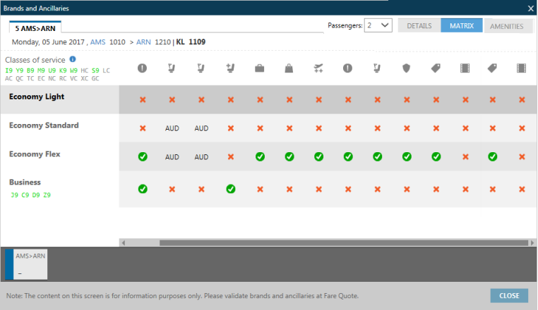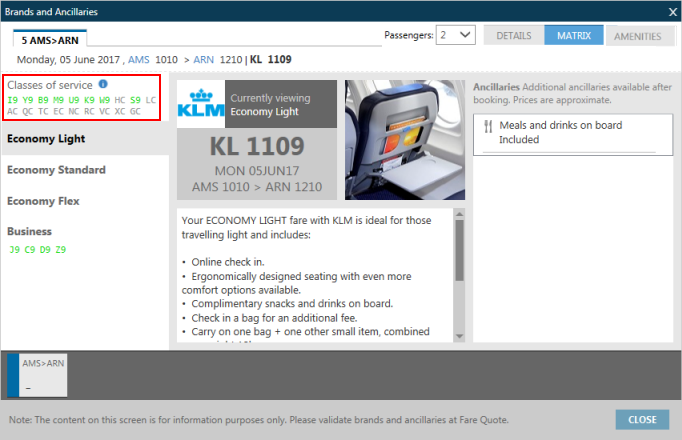 Note: La compagnie aérienne peut ne pas fournir de classes de service associées à une marque spécifique. Dans la section Classes de service, toutes les classes de service associées au vol peuvent être associées à des tarifs sans marque, à un tarif à une seule marque ou à plusieurs tarifs de marque. Vérifiez au niveau du prix/devis. -