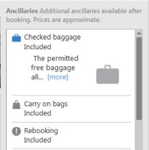 Optionnel. Dans Ancillaries, cliquez sur l’icône d’un service auxiliaire pour afficher les détails de ce service auxiliaire (service facultatif). Consultez la page Magasinage de services auxiliaires pour plus d’informations sur la sélection de services supplémentaires pour les tarifs avec et sans marque.
