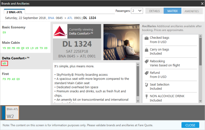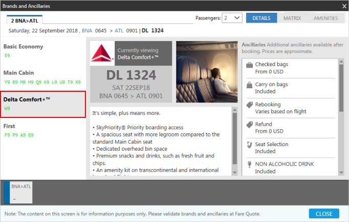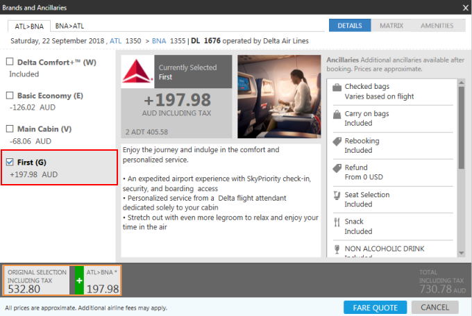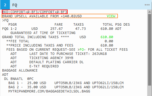 Dans cet exemple, la marque Comfort, qui est le troisième niveau pour ce vol Delta (BF3), est indiquée dans le devis. Les prix et les modificateurs de marque sont inclus dans le tarif.