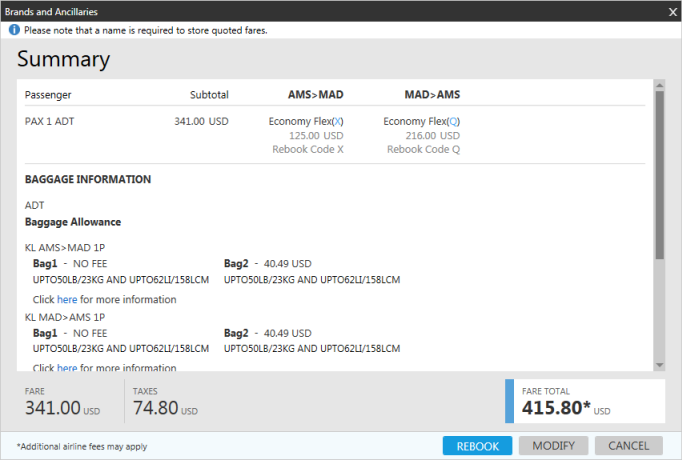 Si les tarifs de marque ne sont pas pris en charge pour le vol sélectionné, un message d’erreur s’affiche lorsque vous cliquez sur l’icône Tarifs de marque : LES INFORMATIONS SUR LA FAMILLE DE TARIFS DE MARQUE NE SONT PAS DISPONIBLES POUR CETTE OPTION.