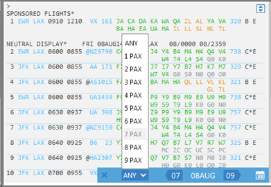 Note: Pour afficher un transporteur spécifique à l’aller et au retour, vous devez ajouter le code du transporteur à chaque trajet. Par exemple, entrez : A1AUGLAXNYC+UA++8AUG+UA |