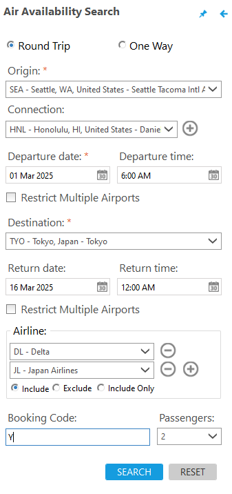 Cliquez sur RECHERCHER pour afficher la réponse de la disponibilité du vol. Consultez les résultats de la disponibilité aérienne pour plus d’informations sur l’utilisation des réponses de disponibilité aérienne.