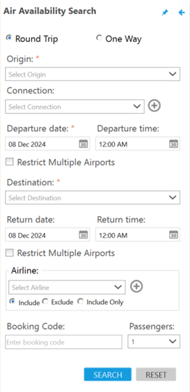 Par défaut, le panneau latéral est désépinglé et se réduit automatiquement si vous cliquez à un emplacement en dehors du panneau latéral. Cependant, vous pouvez cliquer sur l’icône d’épingle pour conserver le panneau latéral si vous travaillez à d’autres endroits dans l’écran Travelport Smartpoint.