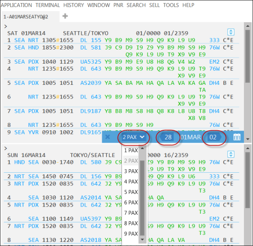 Dans Travelport+ (1G), la barre d’outils du modificateur de disponibilité vous permet de modifier les dates et le nombre de passagers après qu’une première disponibilité ait été effectuée.