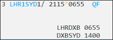 Heures de départ et d’arrivée des vols (en heure locale pour chaque ville). Les heures sont renvoyées en horloges de 12 heures ou de 24 heures selon les paramètres de votre pseudo-code de ville (PCC). Les symboles entre l’heure de départ et l’heure d’arrivée indiquent une différence entre la date de départ et la date d’arrivée :