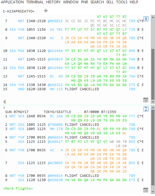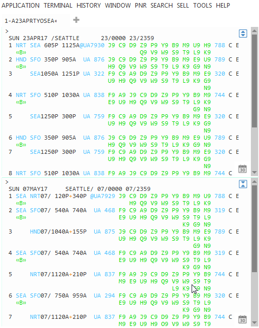 Les exemples suivants montrent les réponses dans Travelport+ (1G) et Apollo (1V), respectivement, pour un itinéraire aller-retour de Seattle (code aéroport/ville SEA) à Tokyo (code ville TYO). Aucune compagnie aérienne, passager, code de réservation (classe de service) n’est inclus dans la demande.
