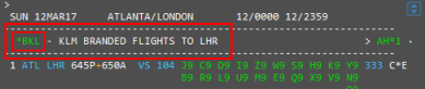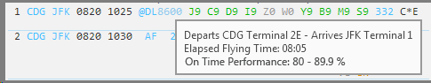 S’il est présent avant le code de la compagnie aérienne, indique un vol en partage de code. Passez la souris sur le symbole @ pour identifier le transporteur exploitant. |