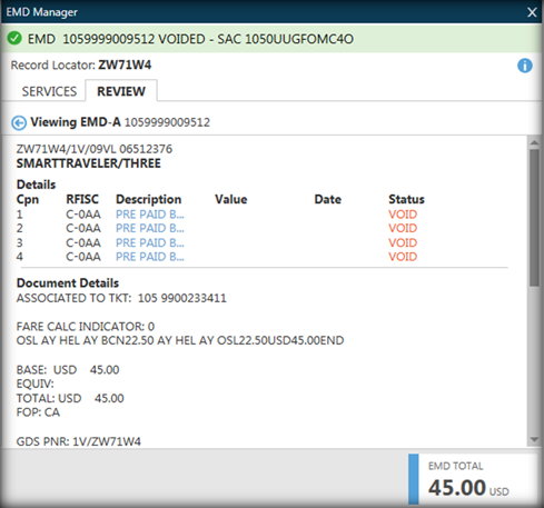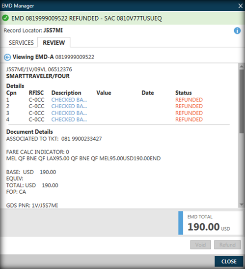 Vous pouvez annuler ou rembourser les EMD si ces fonctions sont prises en charge par la compagnie aérienne. Les segments ou itinéraires annulés peuvent également être annulés ou remboursés, s’ils sont pris en charge par la compagnie aérienne.