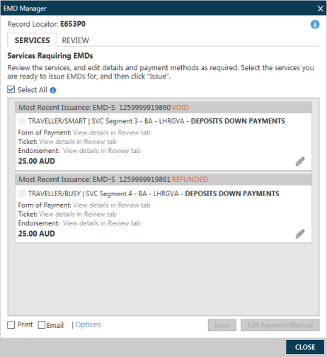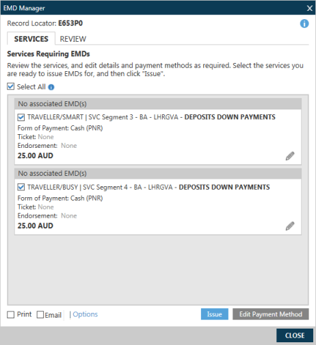 Pourboire! Si vous avez également créé des segments ASCV lors de la réservation de services auxiliaires, la liste affiche ces segments ASVC pour émettre EMD-A. Vous pouvez émettre à la fois EMD-S et EMD-A à partir de la liste combinée SVC/ASCV.