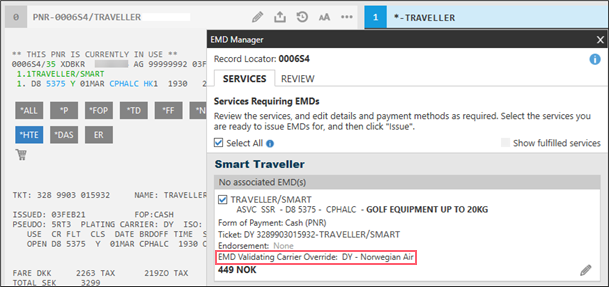 Note: À partir de Smartpoint 10.0, EMD Manager prend en charge la validation du transporteur de placage pour les vols en partage de code pour EMD-A. (Travelport+ (1G uniquement).Plus d’informations