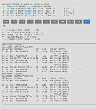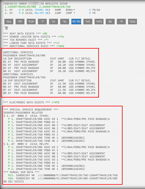 Créez un PNR/Dossier de réservation avec au moins un service auxiliaire lié au vol. Également connus sous le nom de services optionnels ou de services supplémentaires, les services auxiliaires liés au vol comprennent les sièges, les repas, les oreillers et les bagages, qui ont été vendus à partir de la base de données ISM (Industry Standard Message).