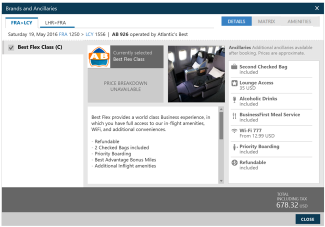 Optionnel. Dans Ancillaries, cliquez sur une icône supplémentaire pour afficher les détails de ce service. Consultez la page Magasinage de services auxiliaires pour plus d’informations sur la sélection de services supplémentaires pour les tarifs avec et sans marque.