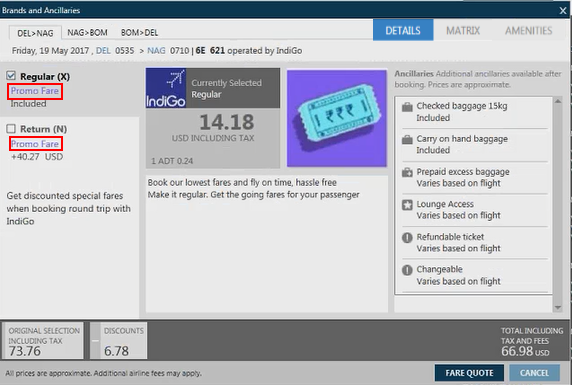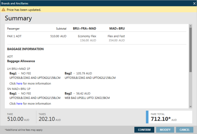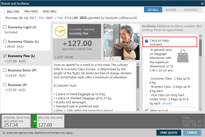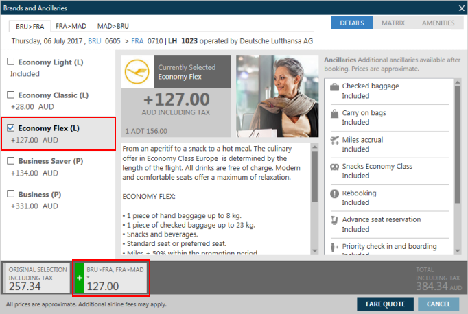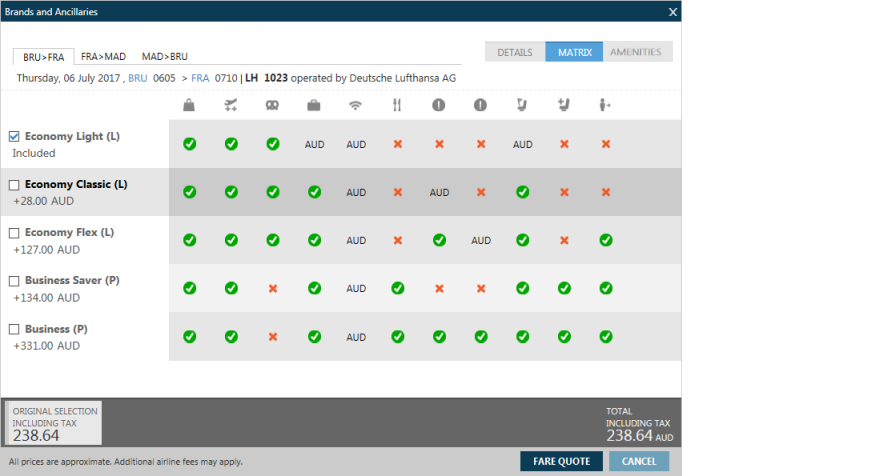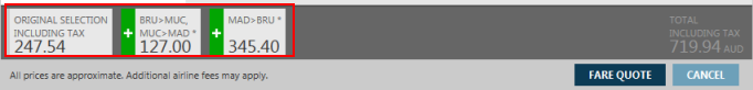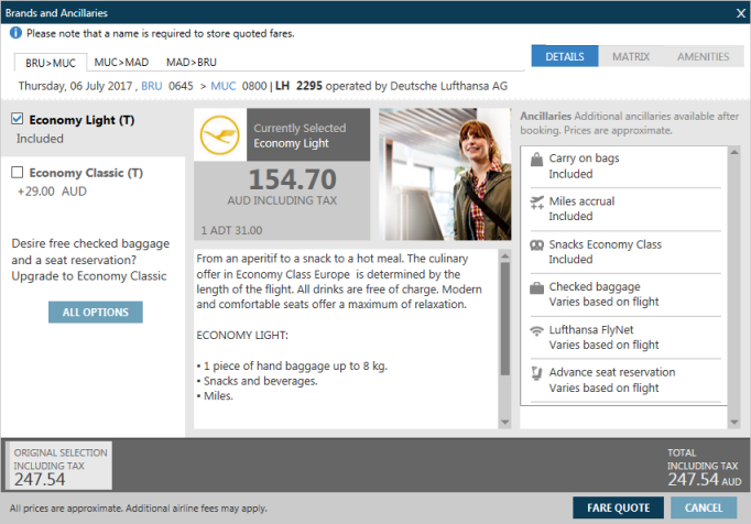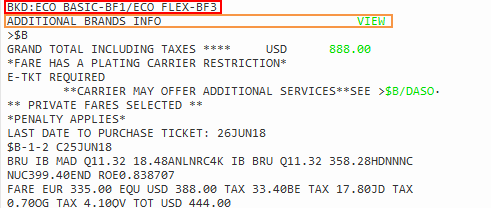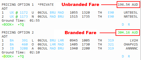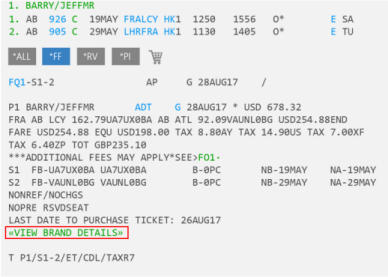Pour les opérateurs du réseau (GDS), le coût de la vente incitative à une marque plus chère est indiqué. Le tarif reste estimé jusqu’à ce qu’un deuxième devis/prix du vol soit établi après que les tarifs de marque et les services supplémentaires ont été sélectionnés .
