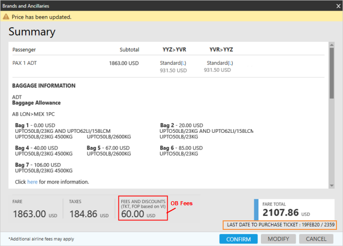 Le message Des frais supplémentaires peuvent s’appliquer est noté car il peut y avoir d’autres frais, y compris les frais OB, qui ne font pas partie du tarif et qui ne peuvent pas être remboursés avant l’émission du billet.