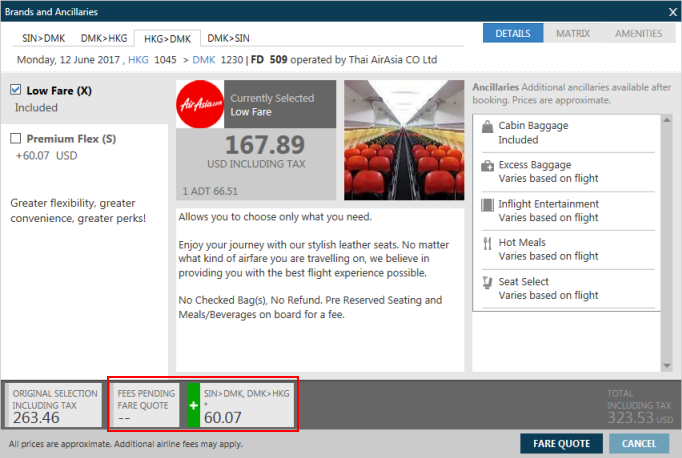 Pour les transporteurs de paiement direct, le coût de la vente incitative à une marque plus chère est indiqué. Le tarif et les frais sont estimés. Un message FRAIS EN ATTENTE DE DEVIS DE TARIF indique que les frais ne peuvent pas être finalisés tant que le premier devis/prix du vol n’a pas été établi après que les tarifs de marque et les services supplémentaires ont été sélectionnés