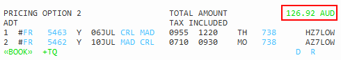Prix de l’itinéraire. L’entrée de base est FQ (Travelport+ - 1G) ou $B (Apollo - 1V). Vous pouvez également fixer le prix par niveau de marque spécifique.