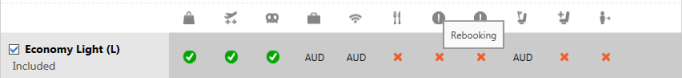 Pourboire! Passez la souris sur la classe de service pour voir le code de base tarifaire, le modificateur de marque et l’indicateur de billet (le cas échéant).