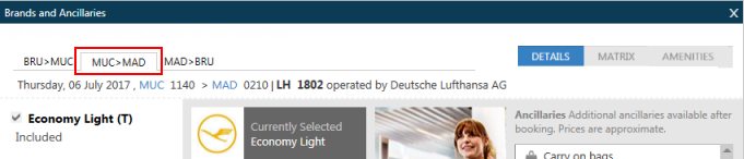 Le cas échéant, sélectionnez les onglets des segments supplémentaires de l’itinéraire et sélectionnez une marque tarifaire. Il est recommandé de choisir la même marque pour tous les segments, si possible.