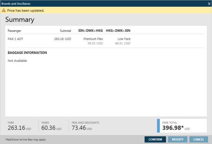 Cliquez sur CONFIRMER pour approuver les sélections de marque et les informations tarifaires. Les segments aériens et les devis/prix associés sont ajoutés à l’itinéraire.