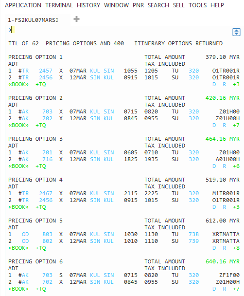 - Créez une recherche Fare Shopping. L’exemple suivant montre les résultats de Flight Shopping pour un itinéraire aller-retour pour deux passagers entre Kuala Lumpur et Singapour.
