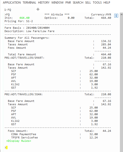 - Travelport+ (1G) : Entrez FQ pour fixer le prix d’un itinéraire tel que réservé. Voir Devis dans le Travelport+ Format Guide pour les modificateurs et des informations supplémentaires.