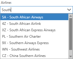 Lorsque vous entrez le code ou le nom, les correspondances possibles s’affichent. Dans l’exemple suivant, toutes les compagnies aériennes qui contiennent South sont affichées.