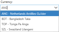 Lorsque vous entrez le code ou le nom, les correspondances possibles s’affichent. Dans l’exemple suivant, les codes de devise, les noms de devise et les noms de pays contenant les lettres ANG sont affichés.