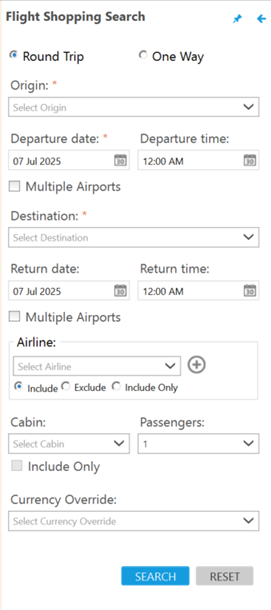 - Cliquez sur RECHERCHER pour afficher la réponse Flight Shopping. Consultez les résultats de Fare Shopping pour plus d’informations sur l’utilisation des réponses Fare Shopping.
