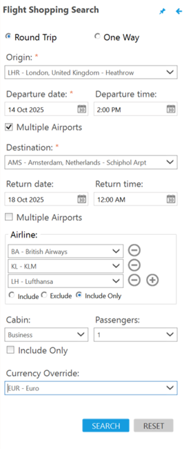 Les transporteurs de paiement direct ne retournent que la classe de cabine spécifiée. Par conséquent, la case Inclure uniquement est automatiquement cochée et limite les réponses à la cabine sélectionnée pour toutes les recherches.