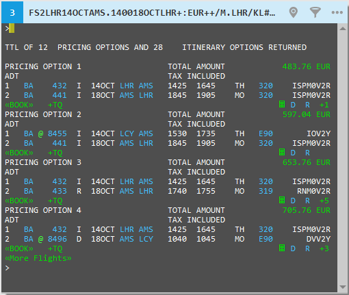 Les résultats suivants s’affichent pour la recherche de tarifs de Londres à Amsterdam. Les quatre premières options sont disponibles sur British Airways (BA), mais KLM et Lufthansa peuvent également être retournées.