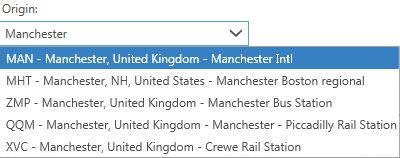 Lorsque vous entrez le code ou le nom, les correspondances possibles s’affichent. Dans l’exemple suivant, tous les emplacements associés au nom de la ville Manchester sont affichés. Notez que les gares ferroviaires et routières peuvent également être affichées.
