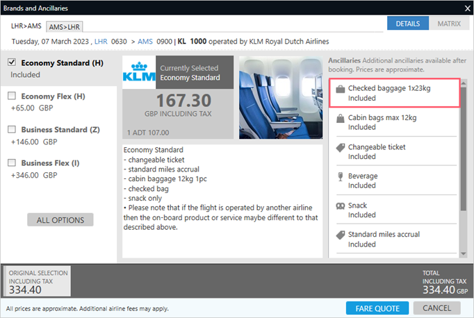 Ce modificateur ne s’applique qu’aux tarifs de marque des transporteurs qui le prennent en charge. Le bagage enregistré est indiqué dans le règlement tarifaire et sur l’écran Marques et Accessoires .