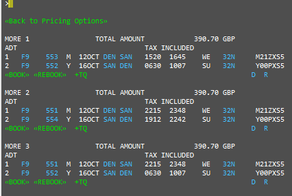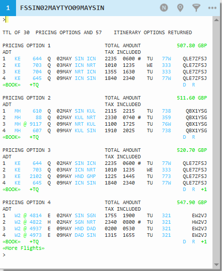 Les options de tarification sont renvoyées dans l’ordre tarifaire le plus bas au plus élevé et peuvent impliquer le même tarif avec plusieurs itinéraires différents. Ces itinéraires sont connus sous le nom d’options d’itinéraire au sein du groupe d’options de tarification. Le nombre d’options d’itinéraire alternatif est également indiqué. Par exemple, +3 indique trois itinéraires supplémentaires pour le même prix.