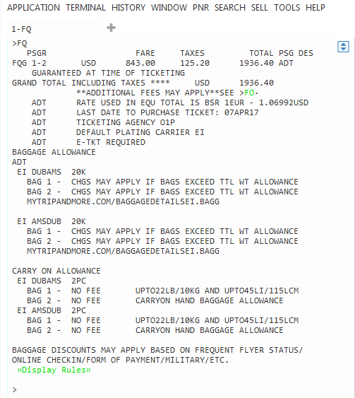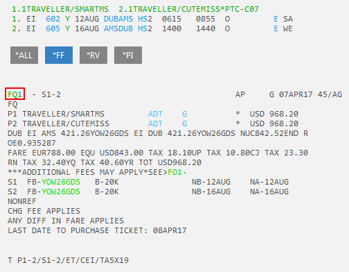 La commande FQ indique le tarif le plus bas pour la classe de service vendu par passager dans le dossier de réservation.