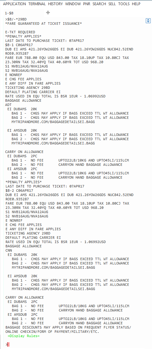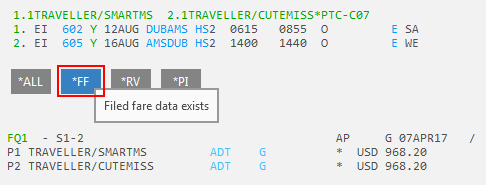 Apollo n’enregistre pas automatiquement le tarif lorsqu’un tarif est tarifé. Par conséquent, une commande suivante (T :$B) est nécessaire pour créer un tarif enregistré (ATFQ ou Automatic Ticketing Fare Quote).