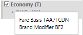 Un modificateur de marque indique le niveau de la marque au sein de la famille tarifaire de la marque. Par exemple, si vous passez la souris sur une classe de service dans l’écran Marques et services auxiliaires, BF2 indique que la classe Économique est le deuxième niveau parmi les cinq niveaux tarifaires de la famille tarifaire.