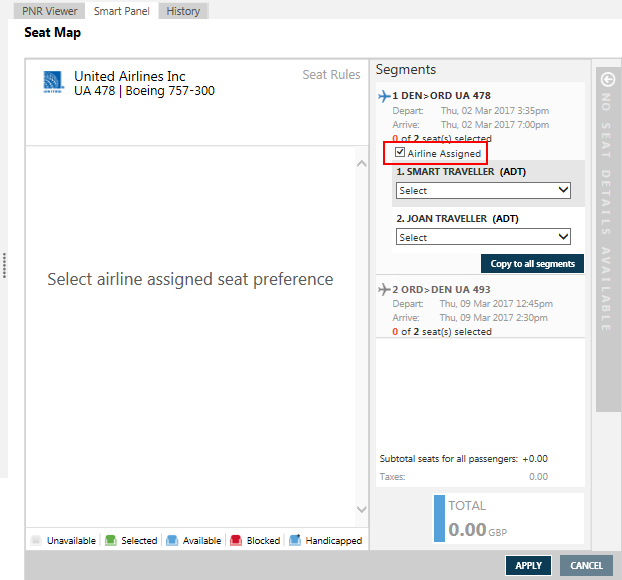 - Un cadre de plan de cabine sans carte s’affiche s’il n’y a pas de places disponibles pour Galileo et Apollo. (Pour les agences qui utilisent également Worldspan, un message d’erreur est renvoyé si aucune place n’est disponible : Plan de cabine graphique non disponible.)
