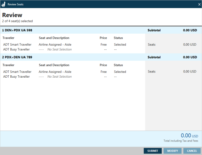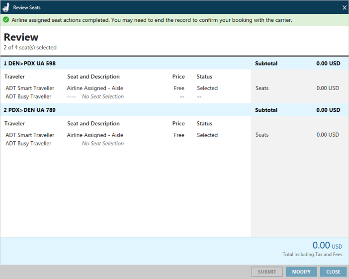 - Lorsque tous les sièges sont attribués, y compris les sièges attribués par la compagnie aérienne, les sièges libres et les sièges payants, cliquez sur VÉRIFIER pour afficher l’écran Vérifier.
