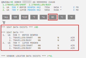 Dans le fichier PNR/Réservation, *SD dans Travelport+ (1G) ou 9D dans Apollo (1V) affiche les informations sur le siège dans le fichier PNR/Réservation.