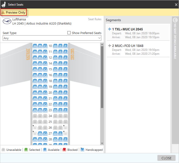 Un avertissement « Aperçu uniquement » en haut de la fenêtre du plan de cabine indique que les sièges peuvent être affichés, mais pas réservés. En mode Aperçu, si vous essayez de sélectionner un siège dans le plan de salle, Smartpoint ignore la sélection.