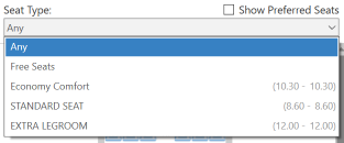 - Optionnel. Dans Type de siège, cliquez sur la flèche N’importe laquelle pour sélectionner parmi les options de siège payant disponibles. La disponibilité des sièges gratuits et payants dépend du transporteur, du vol et du statut de voyageur fréquent du passager.