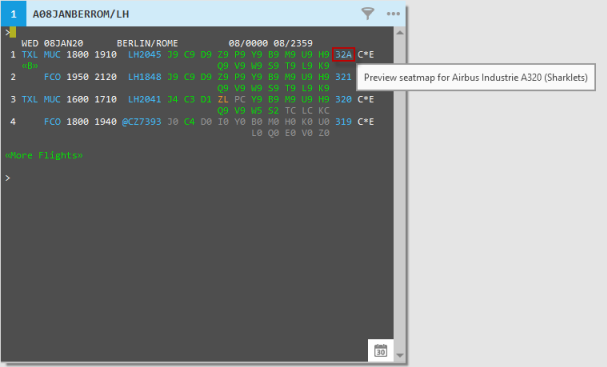 Vous pouvez prévisualiser les plans de cabine avant de réserver à partir des réponses Disponibilité des vols et Tarifs pour les transporteurs du réseau (GDS). Cependant, vous ne pouvez pas attribuer un siège payant sur un transporteur du réseau avant la fin de la transaction du PNR/fichier de réservation.