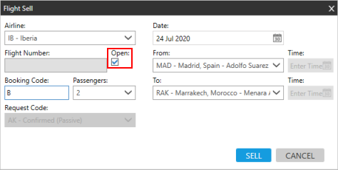 Les segments ouverts sont des segments d’air qui ne spécifient pas le numéro de vol. Les segments ouverts peuvent inclure ou non la date de voyage et sont généralement utilisés pour garantir un tarif même si le voyageur n’est pas certain d’une ou plusieurs dates de voyage.