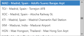 Lorsque vous entrez le code ou le nom, les correspondances possibles s’affichent. Dans l’exemple suivant, tous les codes ou emplacements associés à MAD sont affichés. Notez que les gares ferroviaires et routières peuvent également être affichées.