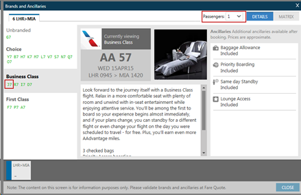 Les sièges peuvent être vendus à partir de la fenêtre Tarifs de marque, en cliquant sur la classe souhaitée sur l’écran. N’oubliez pas de sélectionner le nombre de passagers requis dans le menu déroulant à l’intérieur de la fenêtre avant de sélectionner les sièges.