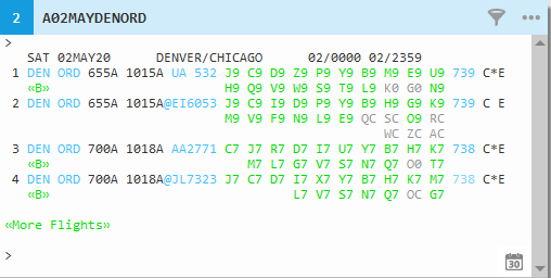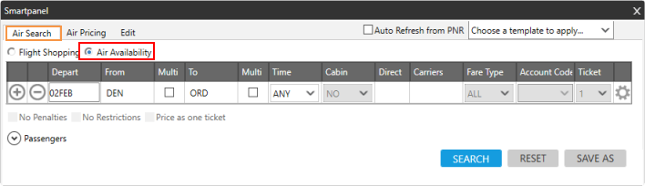 Dans l’onglet AirSearch , sélectionnez la case d’option Disponibilité aérienne . Le premier segment de vol s’affiche avec la date du jour.