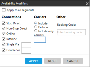 disponibilité pour ouvrir la fenêtre Modificateurs de disponibilité pour saisir des modificateurs de recherche avancée pour les connexions, les transporteurs et les codes de réservation.
