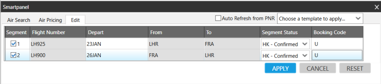 Lorsque vous fixez le prix et enregistrez les tarifs dans l’onglet Tarification de Smartpanel Air , vous pouvez modifier le PNR/Fichier de réservation pour modifier le départ, le statut du segment ou le code de réservation d’un ou plusieurs segments.